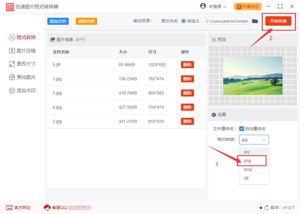 然后,在如下图所示的位置处进行设置,将转换的图片格式设置成“png”格式。再点击上面的【开始转换】按钮,启动软件的格式转换程序,接下来的事情交给软件完成即可。